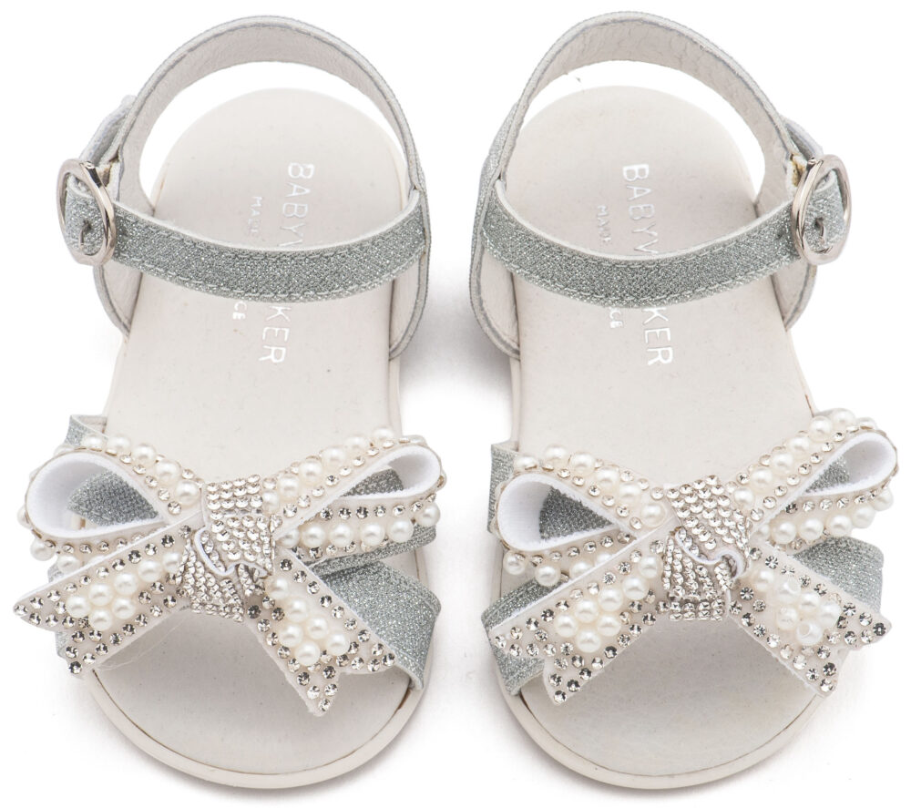 Πέδιλο από μεταλλιζέ ύφασμα διακοσμημένο με φιόγκο από πέρλες σε ασημί χρώμα