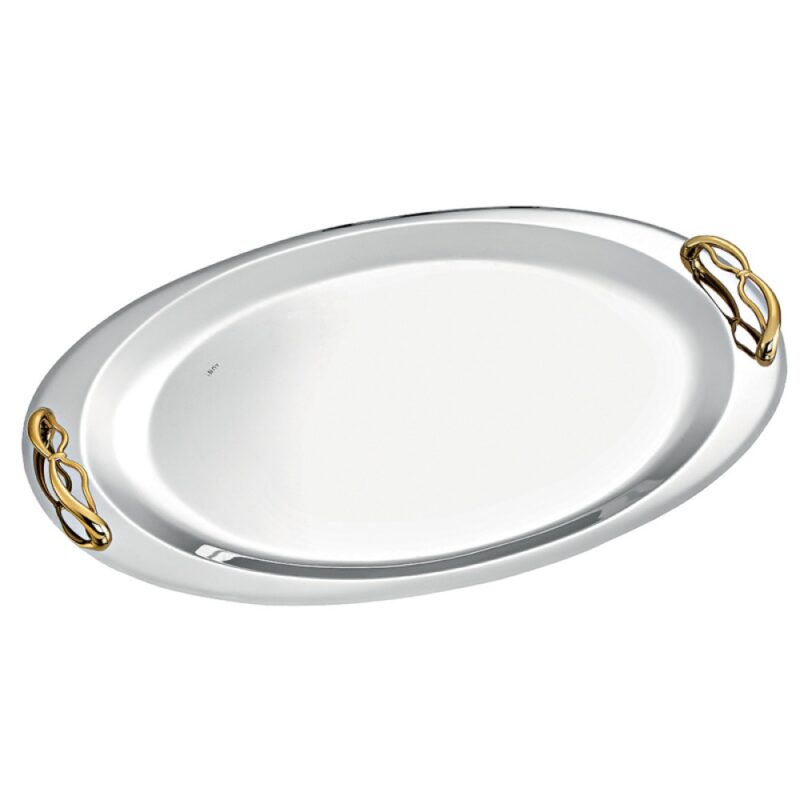 Δίσκος γάμου inox οβάλ σε ασημί χρώμα με λαβές σε απόχρωση του χρυσού.