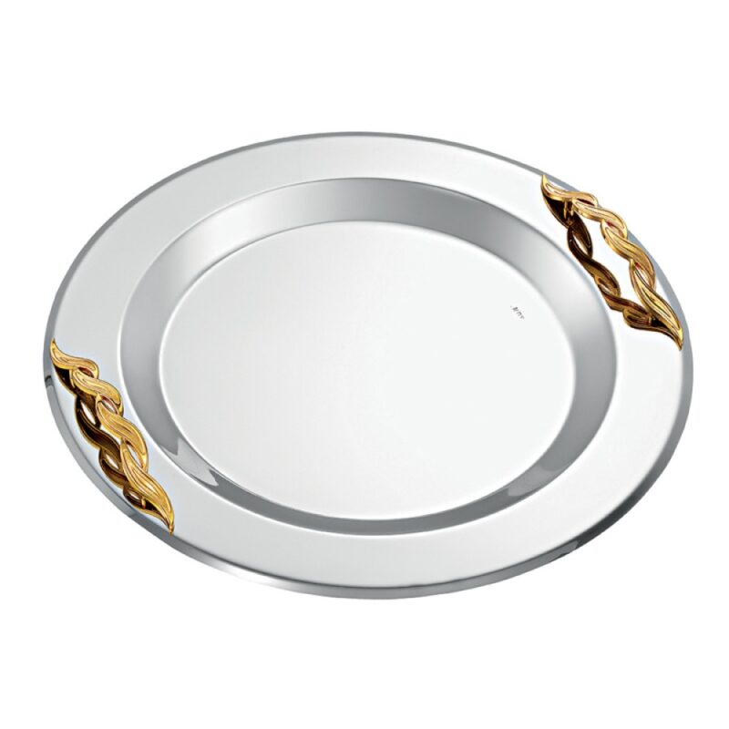 Δίσκος γάμου inox στρογγυλός σε ασημί χρώμα με λαβές σε απόχρωση του χρυσού.