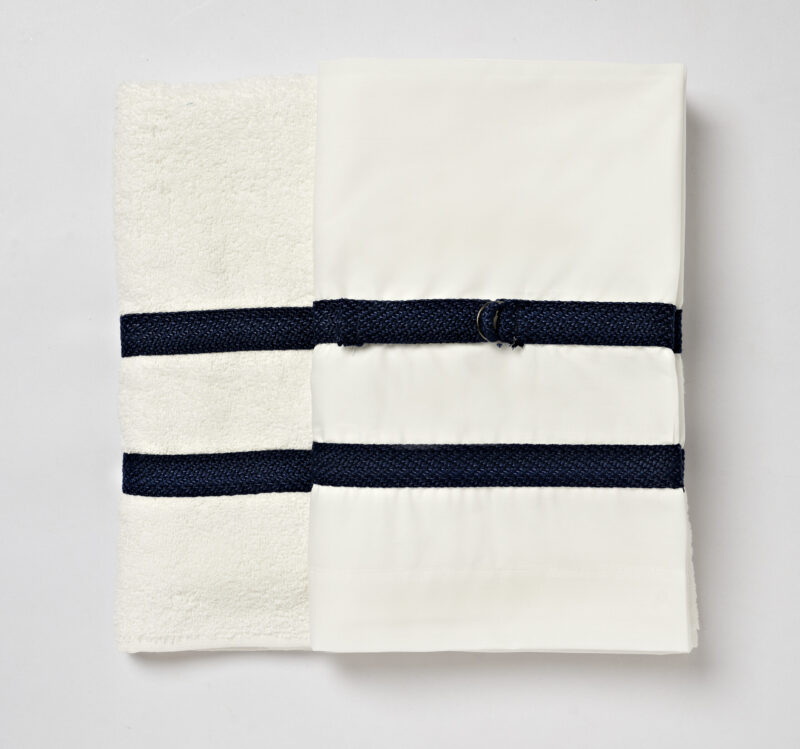Βαμβακερά λαδόπανα σε ιβουάρ χρώμα με διπλό ιμάντα μπλε στο τελείωμα του και ιδιαίτερο δέσιμο. Τα λαδόπανα περιλαμβάνουν μεγάλη πετσέτα και σεντόνι, πετσέτα μικρή και εσώρουχα.