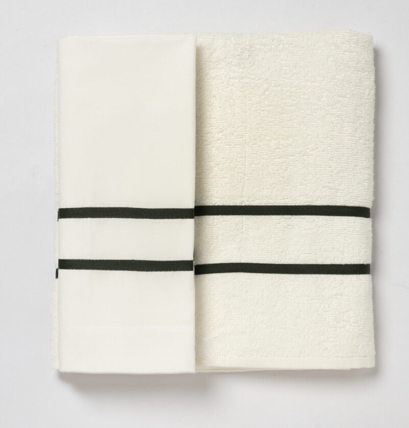 Βαμβακερά λαδόπανα σε ιβουάρ χρώμα με διπλή τρέσα μπλε. Τα λαδόπανα περιλαμβάνουν μεγάλη πετσέτα και σεντόνι, πετσέτα μικρή και εσώρουχα.