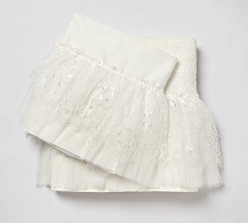 Ιδιαίτερα βαμβακερά λαδόπανα σε ιβουάρ χρώμα με βολάν από τούλι και δαντέλα σε off white απόχρωση. Τα λαδόπανα περιλαμβάνουν μεγάλη πετσέτα και σεντόνι, πετσέτα μικρή και εσώρουχα.