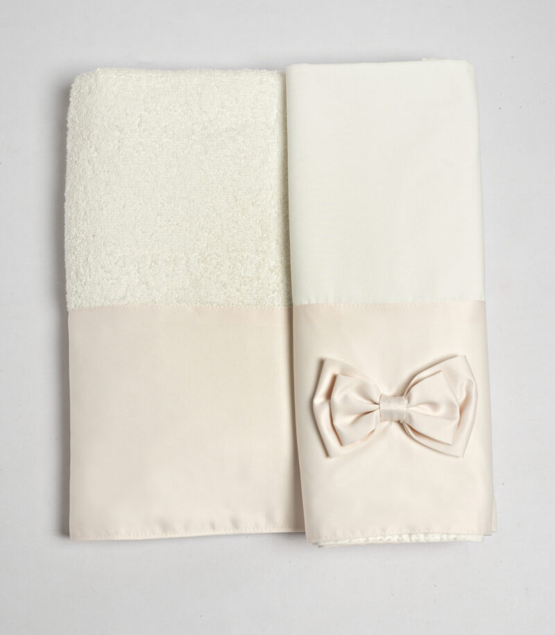 Ιδιαίτερα βαμβακερά λαδόπανα σε ιβουάρ χρώμα και σατέν ύφασμα στο χρώμα της πούδρας στο τελείωμα, στολισμένο με elegant φιογκάκια στην ίδια απόχρωση. Τα λαδόπανα περιλαμβάνουν μεγάλη πετσέτα και σεντόνι, πετσέτα μικρή και εσώρουχα.
