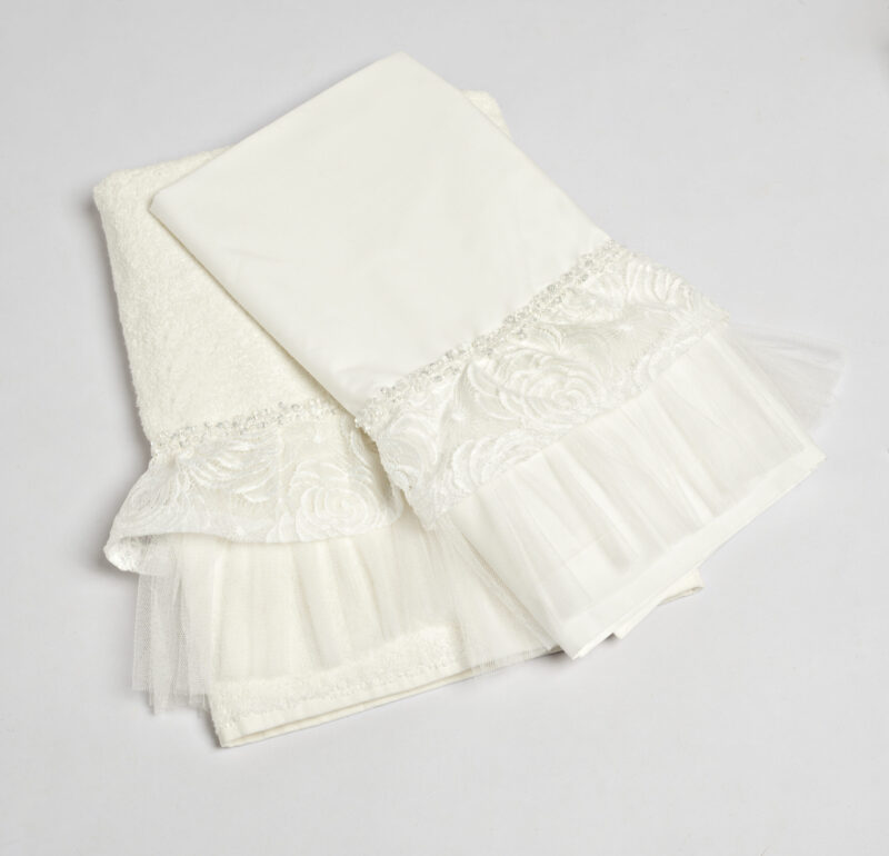 Ιδιαίτερα βαμβακερά λαδόπανα σε ιβουάρ χρώμα με διπλό βολάν από τούλι και δαντέλα σε off white απόχρωση, στολισμένο με ιδιαίτερη τρέσα με διάφανα κρυσταλλάκια. Τα λαδόπανα περιλαμβάνουν μεγάλη πετσέτα και σεντόνι, πετσέτα μικρή και εσώρουχα.