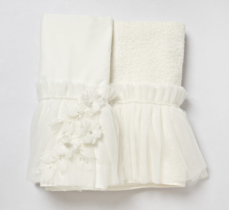 Ιδιαίτερα βαμβακερά λαδόπανα σε ιβουάρ χρώμα με βολάν στο τελείωμα από τούλι off white, στολισμένο με μια σύνθεση λευκών λουλουδιών και τρέσα με διάφανα κρυσταλλάκια. Τα λαδόπανα περιλαμβάνουν μεγάλη πετσέτα και σεντόνι, πετσέτα μικρή και εσώρουχα.